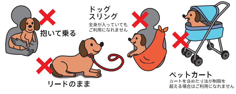 - ペットは全身が入るケースに入れてください。抱いたままやバッグに入れた状態ではご利用いただけません。
