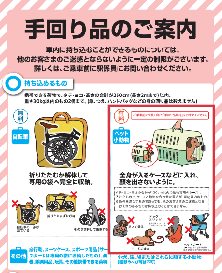 なお、ペットが入るケースと車輪や手押し用の取っ手等が分離した状態であれば、ケースがペットケースの制限の範囲内で、かつ車輪や手押し用の取っ手等ケース以外の部分が無料手回り品の制限の範囲内であれば持ち込むことができます。ただし、この場合であっても、ケース以外の部分等に突起があるなど、他のお客さまに危害を及ぼすおそれがあると判断される場合等については、お持込みをお断りいたします。